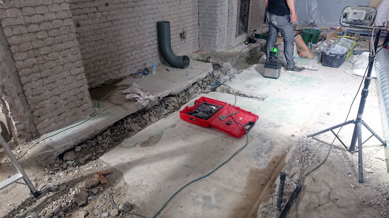 排水の側溝、配管をする為に斫って斫って斫りまくっていただいております。