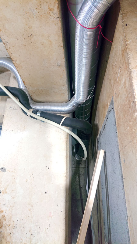 大きな梁をこえて、何とか外まで配管。
