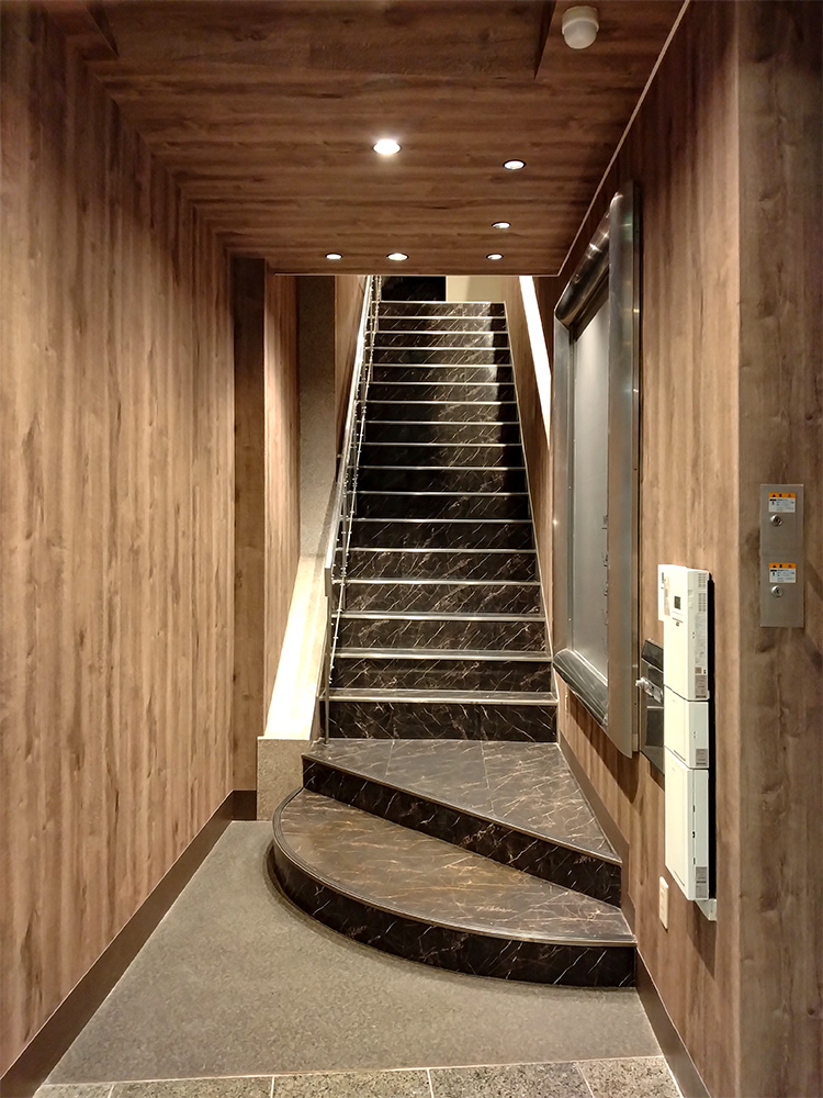 既存黒色の大理石調階段との素材感のコントラストが空間を引き締め、スタイリッシュで落ち着いた雰囲気に。