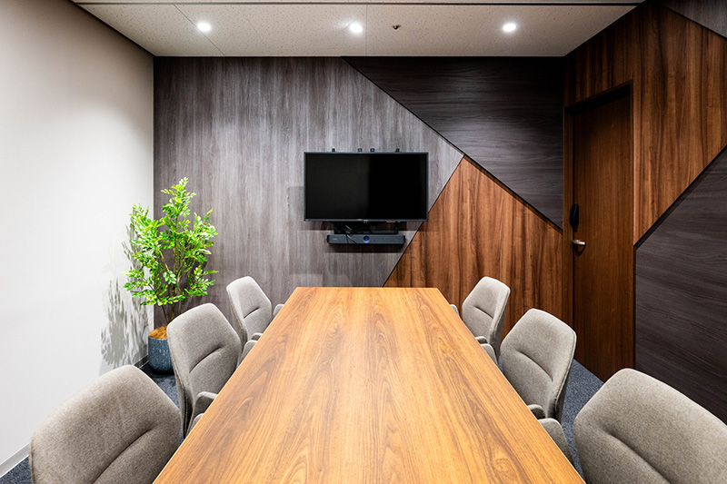 既存の応接室には、あさひグループ様のロゴマークを想起させるような印象的なパターンの壁紙を採用。