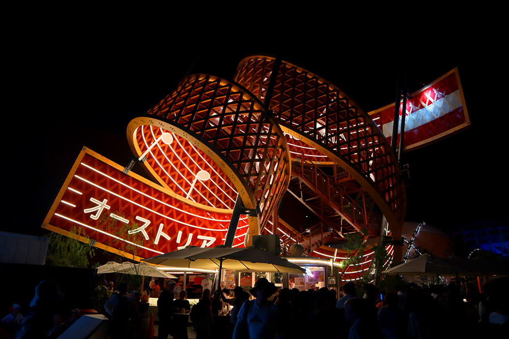 最頂部は109m!パビリオンの前に立つ人と比べると、そのインパクトが一目瞭然。