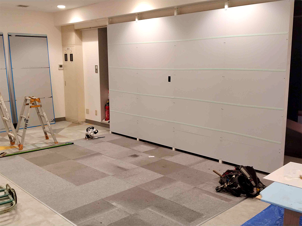 今回は仮設の店舗なので床・壁・天井に傷つけないよう注意しながら工事をしてもらっています。